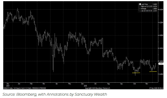 There is a seasonal bias for short-term rates to rise into December and the first quarter of the new year as companies have a higher demand for cash to settle their books for the year. On top of that, the Fed meeting this week has the market pricing in a 96% probability that interest rates will get cut by 25 basis points. The Fed is most likely not going to disappoint investors and will lower rates, but their comments may have a hawkish tone. So, the risk we see this week is that short rates can rise, in particular the 2-Year Treasury yield. We maintain rates are most likely to remain in a downtrend, but short term, they can rally to 3.8%-4.0%. We would be braced for some volatility in rates and stocks this week.