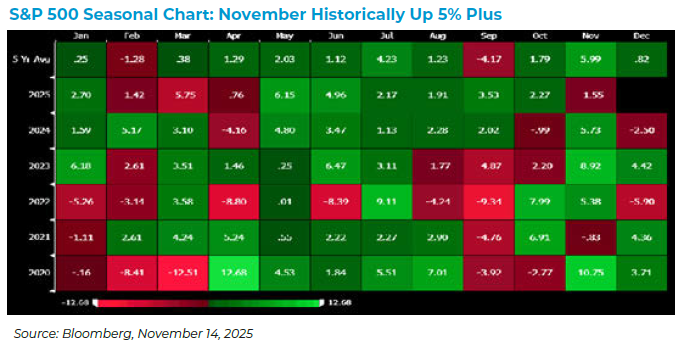 Not even the reopening of the government has been enough to move stocks higher. It is not seasonally normal to have a pullback in November, but we see the market as rotating out of the high valuation Growth stocks and rotating into cheaper Value stocks. Investors are now questioning whether this is a new sustainable trend or just a temporary rebalancing of the market. In our view, the current correction is a temporary rebalancing of the markets and that leadership will remain with Technology Growth companies. However – we may still have a few more weeks of volatility ahead of us. We maintain that the S&P 500 remains on track to rally to 7000 by year-end.